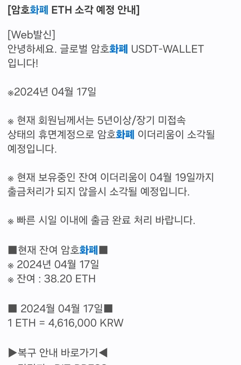 실제로 제가 받은 이더리움 소각 스미싱 문자입니다. 5년 이상 장기 미접속 회원으로 이더리움을 출금하지 않으면 소각된다는 내용으로 스미싱 문자를 받게 되었습니다. 저는 이더리움을 구매한 적이 한 번도 없어서 스팸으로 신고했지만 이더리움을 한 번이라고 구매한 적이 있으신 분들이라면 오해하실 수도 있을 거 같으니 첨부된 사진을 확인하시고 주의하시기 바랍니다.